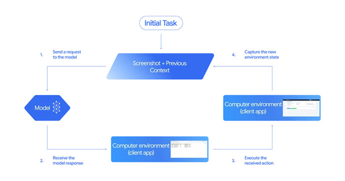 در Gemini 2.5 Computer Use بر خلاف مدلهای سنتی هوش مصنوعی که بر APIها اتکا دارند، چند مرحله در قالب یک چرخه انجام میشود تا وظیفه کامل شود. گام نخست این فرایند ارسال درخواست به مدل است که ورودیهای آن «درخواست کاربر، تصویر لحظهای یا اسکرینشات از محیط کاربری و تاریخچهای از اقدامات اخیر» است. در مرحله بعدی، «مدل [هوش مصنوعی] این ورودیها را تحلیل و به آنها پاسخ میدهد. این پاسخ یک فراخوانی تابع و نمایانگر یکی از اقدامات رابط کاربری مانند کلیک روی یک دکمه یا تایپ در فیلد است.»
