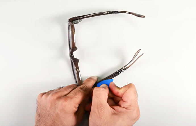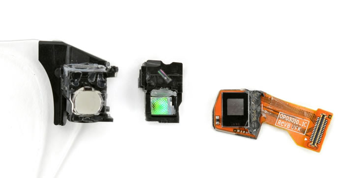 به گفته شهرام مختاری تکنسین iFixit، «هرگونه تعمیری در اینجا نیازمند مهارتهای تخصصی و ابزارهای تخصصی است.» این امر در مورد اسپیکرها نیز صدق میکند چرا که آنها درون عینک لحیم شدهاند. بخش دیگر دشواری تعمیر این عینک به مینی-پروژکتوری مربوط میشود که در دسته سمت راست تعبیه شده است. این پروژکتور – که با تکنولوژی LCoS یا در اصطلاح «کریستال مایع روی سیلیکون» ساخته شده – با گسیل نور از سه LED، تصویری با وضوح 600×600 پیکسل ایجاد میکنند که ظاهراً عاری از هرگونه تصویر غیرواقعی (یا همان artifact) بوده و از بروز پدیده «درخشش چشم» برای افرادی که نظارهگرِ شما هستند، جلوگیری میکند. این ویژگی به نوع لنزهای این عینک مربوط میشود که با لنزهای انکساری متعارف فرق دارند.