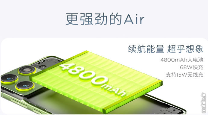 ظرفیت باتری گوشی 4,800 میلی آمپر ساعت است که در مقایسه با S25 Edge و iPhone Air بهترتیب با باتریهای 3,900 و 3149 میلی آمپر ساعتی تفاوت بسیار بزرگی را رقم میزند. این باتری از شارژ سیمی سریع 65 واتی پشتیبانی میکند که اطلاعی در مورد حضور یا غیبت آن از جعبه دستگاه در دسترس نیست. X70 Air از شارژ بیسیم نیز پشتیبانی میکند که توان آن به 15 وات محدود شده است. پردازش در این مدل با پروسسور 4 نانومتری Snapdragon 7 Gen 4 با هستههای A720 و A520 و گرافیک Adreno 722 انجام شده و 12 گیگابایت رم LPDDR5X و 256 یا 512 گیگابایت حافظه داخلی UFS 3.1 دارد. با توجه به ملاحظات مربوط به ضخامت دستگاه طبیعتاً خبری از اسلات حافظه یا جک 3.5 میلیمتری هدست نیز در این گوشی نیست. اسپیکرهای استریو (غایب از iPhone Air)، سیستم خنککننده اتاقک بخار (VC) و NFC برخی دیگر از امکانات X70 Air را تشکیل میدهند.