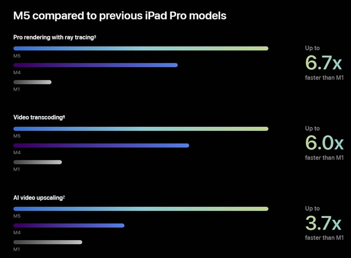 همچنین بهگفته اپل، پهنای باند حافظه با نزدیک به 30 درصد ارتقاء، از 120 گیگابایت در ثانیه به 153 گیگابایت در ثانیه افزایش یافته است و نه تنها عملکرد رهگیری سختافزاری نور یا Ray Tracing نیز بهبود قابل توجهی پیدا کرده، بلکه عملکرد گرافیکی آن نیز در مجموع 45 درصد نسبت به M4 سریعتر شده است. علاوه بر این، غول کوپرتینوئی از افزایش 1.5 برابری سرعت رندر سهبعدی نسبت به نسل قبلی و بهبود 20 درصدی سرعت کدگذاری در نرمافزار Final Cut Pro خبر داده است.