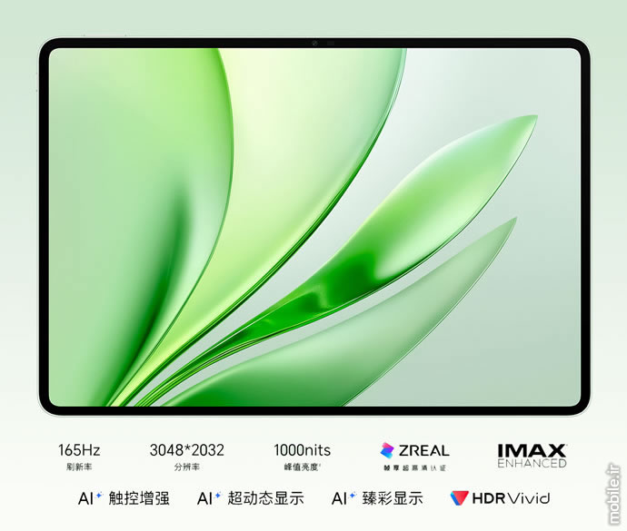 حداکثر روشنایی نمایشگر تبلت در محیطهای پرنور یا در هنگام پخش محتوای HDR به 1,000 نیت بالغ میشود. نکته مثبت دیگر آنکه این نمایشگر برای مواردی مثل کاهش نور آبی، فاقد پرش بودن و همچنین شباهت به تجربه کار با کاغذ، موفق به دریافت تأییدیه از TÜV Rheinland شده است. لازم به ذکر است، این نمایشگر با بهینهسازیهای شرکت IMAX ساخته شده و این نکته آنقدر برای آنر اهمیت داشته که در پشت تبلت، عبارت IMAX Enhanced را حک کرده است.