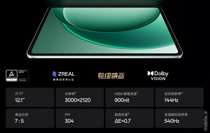 نمایشگر تبلت از نوع السیدی به قطر 12.1 اینچ است. این نمایشگر رزولوشن 2120×3000 پیکسل دارد که تراکم پنل را به 304 پیکسل در اینچ میرساند. نمایشگر تبلت از 1.07 میلیارد رنگ پشتیبانی کرده و با دلتا ای حدود 0.7، دقت رنگ بالایی را به نمایش میگذارد. صفحه نمایش در نسبت تصویر کمتر دیدهشده 7:5 طراحی شده و 88.5 درصد از سطح رویی بدنه را پوشش میدهد. نرخ نمونهبرداری تاچ پنل در حالت پیشفرض 240 هرتز و حداکثر 540 هرتز اعلام شده است. نرخ تازهسازی هم بین مقادیر 30، 48، 50، 60، 90، 120 و 144 هرتز تغییر میکند. پشتیبانی از دالبیویژن و حداکثر روشنایی نقطهای 900 نیت، سایر مشخصات این تبلت را تشکیل میدهند.