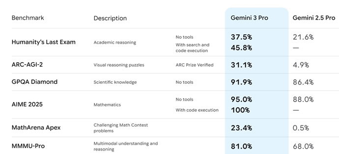 گوگل، Gemini 3 Pro را مدلی معرفی میکند که بهطور تقریبی در تمام معیارهای اصلی هوش مصنوعی از بیشترِ مدلهای پیشرو فراتر میرود. این مدل به گفته ابرشرکت آمریکایی، در حال حاضر با امتیاز 1,501 در رتبهبندیElo در جایگاه نخست جدول امتیازات LMArena (پلتفرمی برای ارزیابی مدلهای هوش مصنوعی بر اساس نظر کاربران) قرار دارد. همچنین گوگل از امتیاز 91.9 درصد این مدل در سیستم سنجشGPQA Diamond، امتیاز 37.5 درصد در Humanity’s Last Exam و امتیاز 23.4 درصد در MathArena Apex خبر داده است.