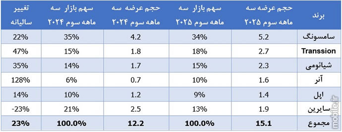 بر اساس گزارش Omdia، در سهماهه سوم 2025 سامسونگ با عرضه 5.2 میلیون اسمارتفون و سهم بازار 34 درصدی جایگاه نخست را در اختیار داشته است. رتبه دوم این جدول به TRANSSION تعلق دارد که موفق به عرضه 2.7 میلیون گوشی شده و 18 درصد از سهم بازار را به خود اختصاص داده است. شیائومی و آنر سومین و چهارمین تولیدکننده برتر اسمارتفون در فصل گذشته بودهاند و به ترتیب 2.3 و 1.6 میلیون گوشی به بازار خاورمیانه عرضه کردهاند و در نهایت اپل با ارائه 1.4 میلیون دستگاه آیفون و سهم بازار 9 درصدی این فهرست را کامل کرده است.