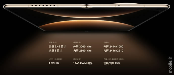 صفحهنمایش خارجی Mate X7 بهجای 6.45 اینچ سال قبل، 6.49 اینچیست اما وضوح 1080×2444 پیکسلی آن تفاوت خاصی ندارد این پنل 10 بیتی OLED که لبههای آن در هر چهار طرف خمیده است از نرخ رفرش متغیر 1 تا 120 هرتزی پشتیبانی کرده و همچنان از همان پوشش «نسل دوم Kunlun Glass» بهره میبرد.