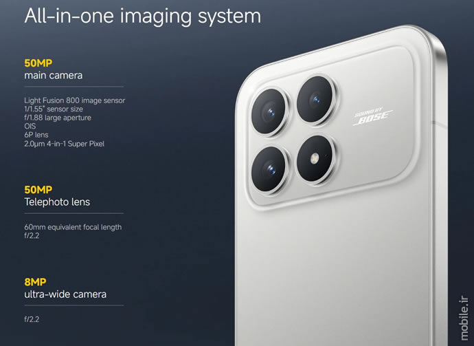 دوربین 50 مگاپیکسلی اصلی از نوع Light Fusion 900 شرکت آمنی ویژن با سنسور 1/1.31 اینچی و پیکسلهای 1.2 میکرونیست که یک لنز 7 مرحلهای f/1.7 OIS در مقابل آن قرار دارد. دوربین 50 مگاپیکسلی دوم ظاهراً با همان حسگر کوچک 1/2.76 اینچی سامسونگ JN5 ارائه میشود که با کمک یک لنز پریسکوپی f/3.0 با فاصله کانونی 115 میلیمتری، 5 برابر زوم اپتیکال را پوشش میدهد. این دوربین نیز به OIS مجهز بوده و حداقل فاصله فوکوس آن 30 سانتیمتر است. در نهایت سومین و آخرین دوربین این قسمت یک 50 مگاپیکسلی دیگر با سنسور بسیار کوچک 1/2.88 اینچی و لنز اولتراواید f/2.4 با فاصله کانونی 18 میلیمتریست که در غیاب فوکوس خودکار امکان تصویربرداری ماکرو را ندارد. دوربین اصلی این مجموعه با وضوح 8K/30fps فبلمبرداری کرده و با کاهش وضوح به 4K میتوان سرعت برداشت را به 60 فریم بر ثانیه رساند.