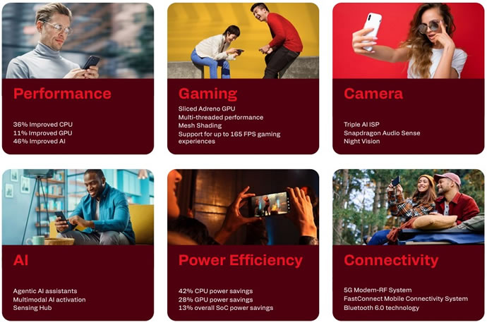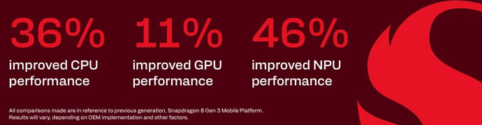 کوالکام در توصیف پردازنده جدید خود، عملکرد یا performance آن را با تراشه 4 نانومتری Snapdragon 8 Gen 3 مقایسه میکند که حالا بیش از دو سال از معرفی آن میگذرد. به گفته شرکت آمریکایی، Snapdragon 8 Gen 5 از نظر عملکرد CPU تا 36 درصد و در خروجی پردازش گرافیکی تا 11 درصد نسبت به Snapdragon 8 Gen 3 بهتر عمل میکند و مصرف انرژی آن در این دو بخش نیز به ترتیب 42 و 28 درصد بهبود یافته است. همچنین عملکرد این تراشه در وظایف مرتبط با هوش مصنوعی حدود 46 درصد ارتقاء یافته و در کنار آن میزان مصرف کلی آن هم در مقایسه با Snapdragon 8 Gen 3 تا 13 درصد کاهش یافته است.