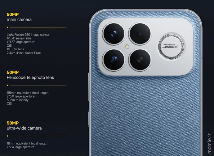 دوربین 50 مگاپیکسلی اصلی از سنسور بزرگ 1/1.31 اینچی Light Fusion 900 آمنی ویژن با پیکسلهای 1.2 میکرونی و لنز 7 مرحلهای f/1.7 OIS بهره میبرد و دوربین 50 مگاپیکسلی دوم نیز یک سنسور بسیار کوچک 1/2.76 اینچی با لنز پریسکوپی f/3.0 با فاصله کانونی 115 میلیمتری، 5 برابر زوم اپتیکال را پوشش میدهد. دوربین 50 مگاپیکسلی سوم نیز یک سنسور کوچکتر 1/2.88 ایچی با لنز اولترواید f/2.4 دارد که بدون فوکوس خودکار است. پردازنده پرچمدار گوشی از نوع Snapdragon 8 Elite Gen 5 بوده و 12GB/16GB رم و 256GB/512GB/1TB حافظه داخلی پر سرعت دارد. ظرفیت باتری گوشی 6,500mAh است که با شاررژهای سیمی و بیسیم بهترتیب با حداکثر توانهای 100 و 50 وات تغذیه میشود.