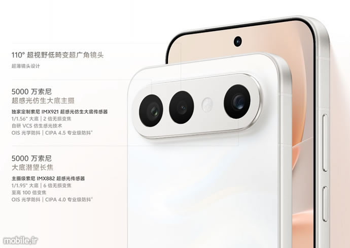 در بخش پشتی سه دوربین بهچشم میخورد که شامل یک نمونه 50 مگاپیکسلی با سنسور نچندان بزرگ 1/1.56 اینچی سونی IMX921 و لنز 7 مرحلهای f/1.6 مجهز به OIS است که آن را یک 50 مگاپیکسلی دیگر با سنسور کوچک 1/1.95 اینچی سونی IMX882 همراهی میکند که در مقابل آن ظاهراً یک لنز 4 مرحلهای ساده از نوع پریسکوپی مجهز به OIS با f/2.7 و ظاهراً 3 برابر زوم اپتیکال قرار دارد. دوربین سوم نیز یک 8 مگاپیکسلی ساده با سنسور اعلام نشده و لنز f/2.2 اولتراواید با میدان دید 110 درجهای است که از فوکوس خودکار نیز پشتیبانی نمیکند.