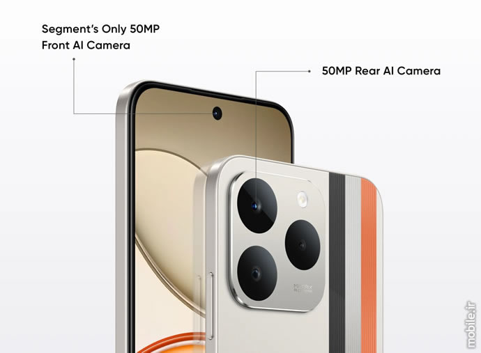 در بخش پشتی گوشی تنها یک دوربین در نظر گرفته شده و دو دایره دیگر حکم تزیینی دارند. ریلمی اشارهای به اندازه سنسور دوربین 50 مگاپیکسلی اصلی این مدل نکرده اما با توجه به کلاس دستگاه احتمالاً با دوربین چندان پیشرفتهای روبرو نیستیم. در مقابل این سنسور یک لنز ساده 5 مرحلهای فاقد OIS حضور دارد که از دیافراگم f/1.8 برخوردار است. این دوربین با توجه به محدودیت پردازنده حداکثر از برداشت ویدئوی 1080p/60fps پشتیبانی میکند.