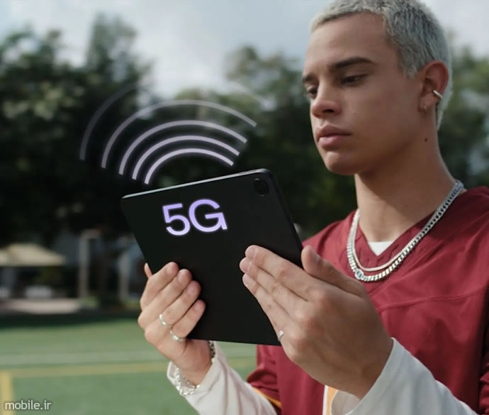 کلیت طراحی بخش پشتی تبلت تفاوتی با نمونه دو سال پیش ندارد و لبههای گرد پیرامون دستگاه و حلقه بزرگ دوربین در مرکز و بالای بخش پشتی در وضعیت افقی در اینجا نیز تکرار شده است، اما نوار براق همرنگ بدنه جایی در محصول تازه ندارد. این تبلت در دو رنگ مشکی و بنفش یاسی (Lavender Drift) و دو مدل وایفای و 5G تولید میشود که پشتیبانی از اتصال 5G تنها برای رنگ مشکی در نظر گرفته شده است.