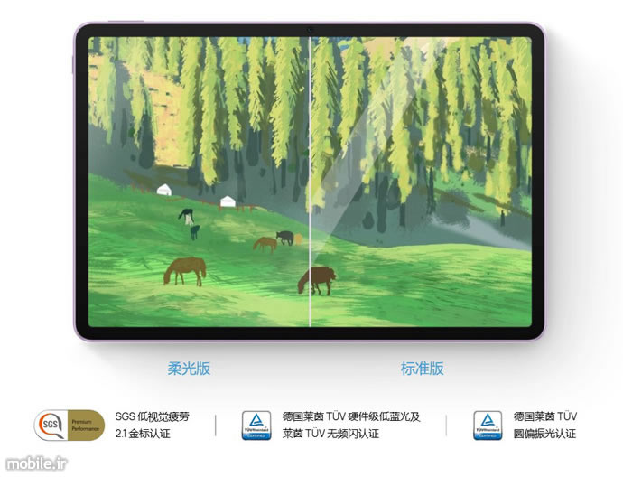 همان طور که گفته شد، علاوهبر ورژن استاندارد، MatePad 11.5 (2026) در یک ورژن دیگر تحت عنوان Soft Light نیز به تولید میرسد. طبق ادعای هواوی، به لطف پوشش چند لایه نانومغناطیسی روی صفحه این ورژن، انعکاس نور از سطح نمایشگر تا 60 درصد کاهش یافته است. همچنین، تکنولوژی خاصی که شرکت سازنده از آن با عنوان «تکنولوژی ضدانعکاس حکاکی نانو» یاد میکند، میتواند تا 99 درصد از تداخل نور محیطی جلوگیری کند. بد نیست بدانید، علاوهبر تأییدیههای ذکر شده برای ورژن استاندارد، نمایشگر نسخه Soft Light برای شبیهسازی هرچه بیشتر نور طبیعی به قابلیتی موسوم به «قطبش دایرهای» مجهز شده که مورد تأیید TÜV Rheinland قرار گرفته است. دریافت «تأییدیه طلایی» از SGS برای کاهش خستگی بصری نیز، در بین امکانات نمایشگر در ورژن Soft Light دیده میشود.