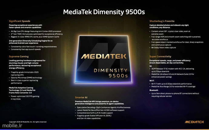 | برچسبها : | سیستم روی تراشه SoC (System on a Chip) ، دیمنسیتی 9500 اس Dimensity 9500s ، دیمنسیتی 8500 Dimensity 8500 | |