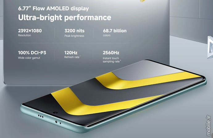 صفحهنمایش 6.77 اینچی دستگاه نسبت به پنل 6.88 اینچی Poco M7 اندکی کوچکتر شده اما در تمامی جنبههای دیگر با پیشرفت روبرو شده است؛ این پنل امولد نهتنها دیگر از نوع LCD نیست بلکه وضوح آن نیز از اچدی پلاس به فول اچدی پلاس (1080×2392 پیکسل) ارتقاء پیدا کرده است. این صفحهنمایش 12 بیتی از نرخ رفرش غیر تطبیقی حداکثر 120 هرتز و روشنایی دستی 800 نیتی بهره میبرد اما ظاهراً امکان محتوای HDR10 برای آن پیشبینی نشده است. دوربین سلفی 20 مگاپیکسلی یک نمونه ساده با سنسور یکچهارم اینچی و لنز 4 مرحلهایست و سنسور اثر انگشت نیز بهصورت نوری به درون صفحهنمایش منتقل شده است.