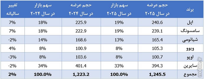 طبق این گزارش، اپل سلطان بلامنازع بازار جهانی اسمارتفون در سال 2025 میلادی بوده و با عرضه 240.6 میلیون آیفون و سهم بازار 19 درصدی، موفق به ثبت رکورد تاریخی و حفظ جایگاه نخست خود برای سومین سال پیاپی شده است. از نگاه کارشناسان Omdia، عرضه آیفون به بالاترین حجم خود در سهماهه چهارم 2025 رسیده و همین عامل در کنار رشد سالانه 26 درصدی در سرزمین اصلی چین به سبب افزایش تقاضا برای سری iPhone 17، موتور محرکه عملکرد قدرتمند غول کوپرتینوئی در این دوره بوده است.