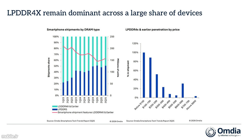 به گفته Runar Bjorhovde تحلیلگر ارشد Omdia «اگر چه 2025 در مجموع سال مثبتی برای اکثر فروشندگان بوده، اما موانعی برای [سال] 2026 در حال شکلگیری است.» او ضمن اشاره به گزارش اخیر Omdia درباره DRAM، افزایش فشارهای جانبی عرضه در NAND، DRAM و دیگر نیمهرساناها را از جمله دغدغههای اصلی تولیدکنندگان اسمارتفون عنوان میکند. از دید او، این دست محدودیتها میتوانند با کاهش حاشیه سود، شرکتها را ناچار به اصلاح قیمت کنند و در نهایت تقاضای مصرفکنندگان را کاهش میدهند.