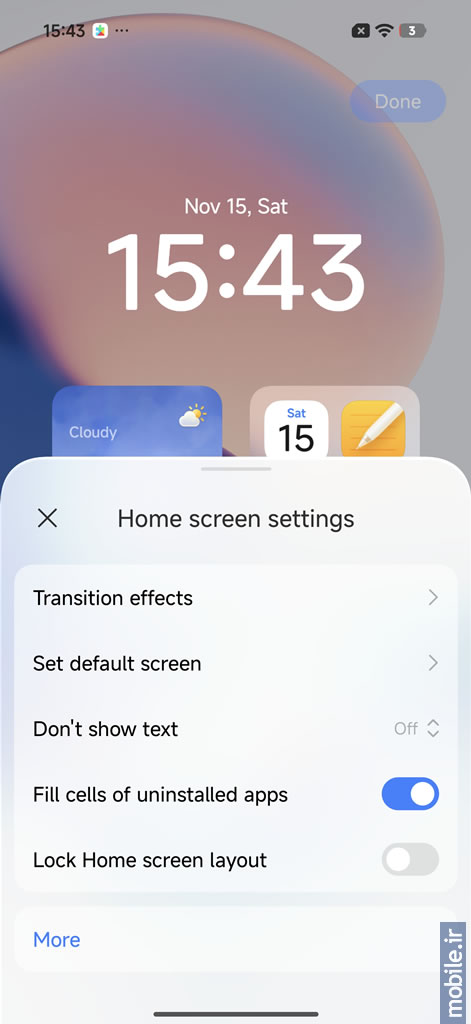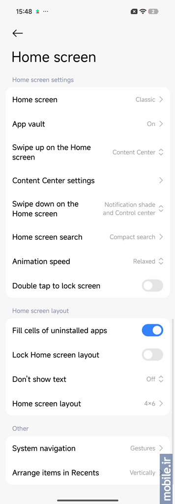 لمس گزینه Settings در این حالت، تنظیمات دیگری را به تصویر میکشد که از آن جمله میتوان به تغییر افکت حرکت بین صفحات، انتخاب صفحه دسکتاپ پیشفرض، پر کردن خودکار جای خالی برنامههای حذف شده و قفل کردن ترکیب فعلی صفحه هوم اشاره کرد. این بخش هیچ تفاوتی با هایپر او اس 2 ندارد.