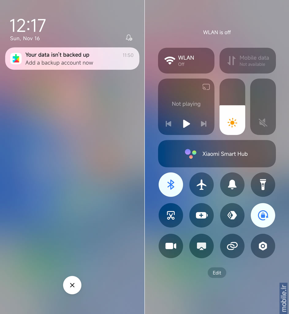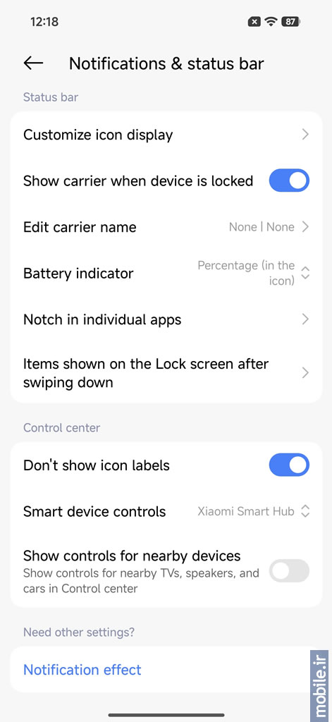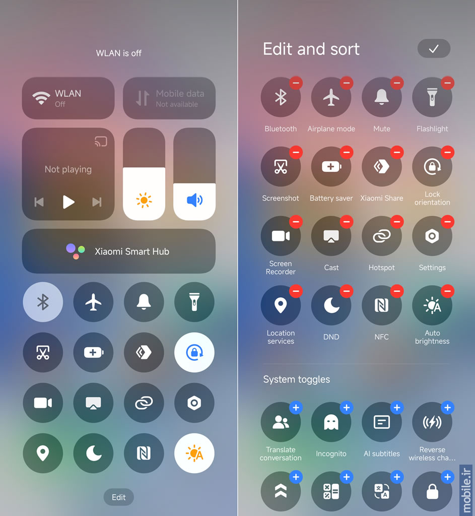 در بخش تنظیمات و تاگلها یا کنترلسنتر این قسمت همچنان از آیکونهای بزرگی برای وایفای و دیتای موبایلی در بالا استفاده شده که فرم آنها مثل قبل افقی بوده و و گزینه تغییر روشنایی و حجم صدا نیز همچنان در پایین آنها حضور دارند. کنترلرهای موزیک در حال پخش و اسمارتهاب شیائومی نیز همان طراحی پیشین را ارائه میکنند. نکته منفی اصلی در این منو همچنان به تصمیم شیائومی برای حذف برچسبهای اسمی آیکونهای این قسمت باز میگردد که با توجه به مشخص نبودن مفهوم برخی آیکونها ممکن است کاربر را در یافتن یک گزینه خاص سردرگم کند. این مشکل البته از منوی Notifications & status bar از منوی تنظیمات با خاموش کردن گزینه Don’t show icon labels قابل برطرف کردن است. نبود برخی از تاگلهای مهم از جمله DND، حالت تاریک و لوکیشن در لیست گزینههای پیشفرض این قسمت نیز نکته منفی دیگری بهحساب شیائومی واریز میکند.
