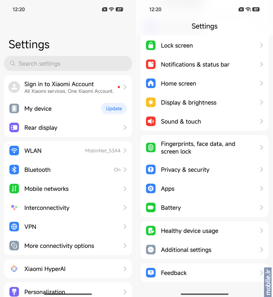 منوی تنظیمات یا Settings هیچ تفاوتی با هایپر او اس نسل دوم ندارد و گزینههای مختلف آن در مجموع در شش بخش مجزا شامل اطلاعات دستگاه و حساب کاربری شیائومی، زیر مجموعه ارتباطات، هوش مصنوعی Hyper AI، منوهای مرتبط با صفحهنمایش و شخصیسازی، قسمت امنیت، اپلیکیشن و حریم خصوصی و در نهایت گزینه تنظیمات اضافی مرتب شدهاند که این آخری برخی موارد مهم مثل زبان، صفحهکلید و تاریخ را در خود جای داده است.