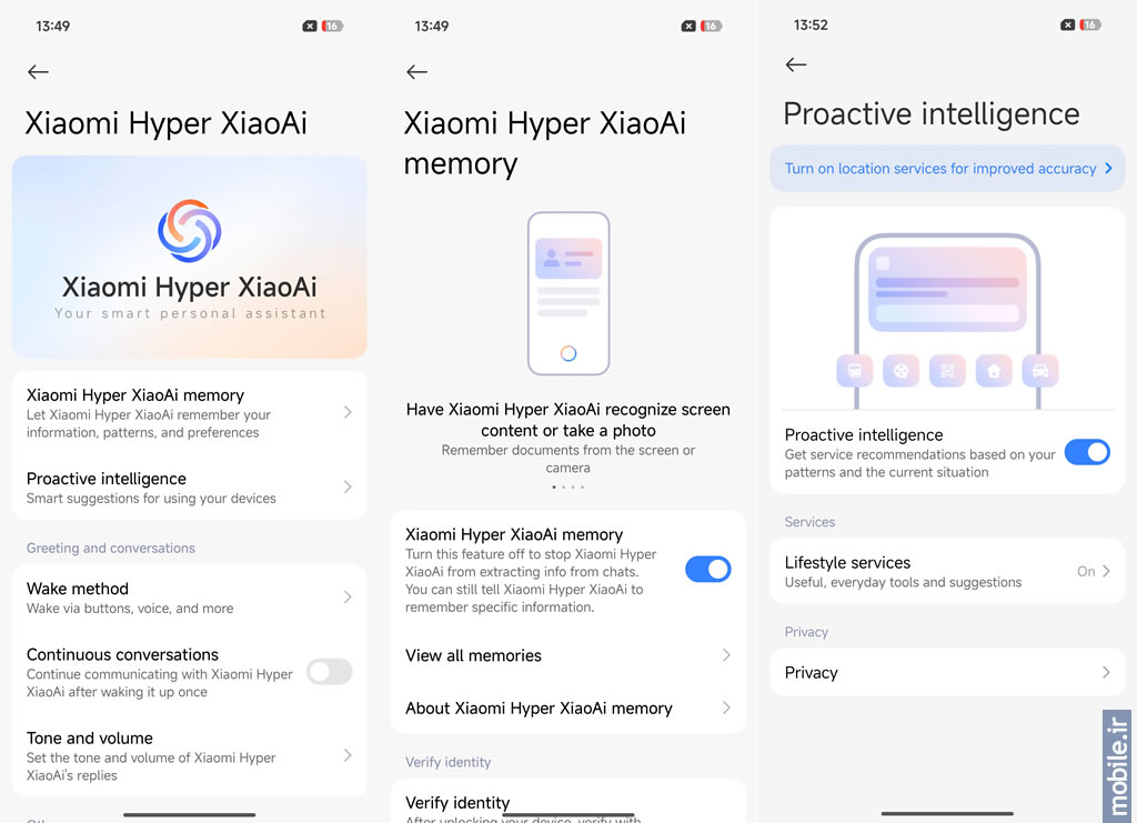 بخش هوش مصنوعی Xiaomi HyperAI در منوی تنظیمات مثل قبل دو گزینه را در خود جای داد که فقط نام یکی از آنها از Mi AI به Xiaomi Hyper XiaoAI تغییر کرد و AI app boost سر جای خود است. یکی از گزینههای Hyper XiaoAI بخش حافظه یا مموری است که بهصورت پیشفرض فعال بوده و اطلاعات شما را از چتها استخراج میکند و بخش دیگری با نام Proactive intelligence نیز پیشنهادهایی را با توجه به الگوها و موقعیت مکانی فعلی شما ارائه میکند و این گزینه نیز بهصورت پیشفرض فعال است.