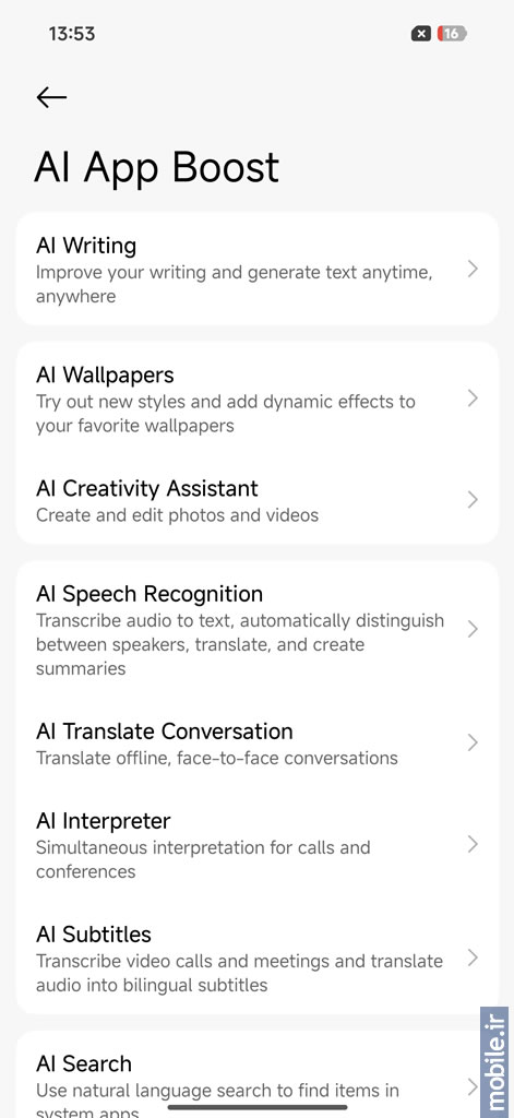 گزینه AI app boost نیز روی کاغذ برای ارتقاء عملکرد اپلیکیشنها در قالب مواردی مثل AI writing (بهبود نوشتار و تولید متن)، AI dynamic wallpapers (ایجاد تصاویر پسزمینه داینامیک با هوش مصنوعی)، AI speech recognition (تبدیل صدا به متن با تشخیص گوینده)، AI Interpreter (مترجم همزمان برای تماسها و کنفرانسها)، AI subtitles (ایجاد زیرنویس برای تماسهای ویدئویی و میتینگها) و AI search (استفاده از زبان عادی برای جستوجوی آیتمها در اپلیکیشنهای سیستمی) در نظر گرفته شده است.