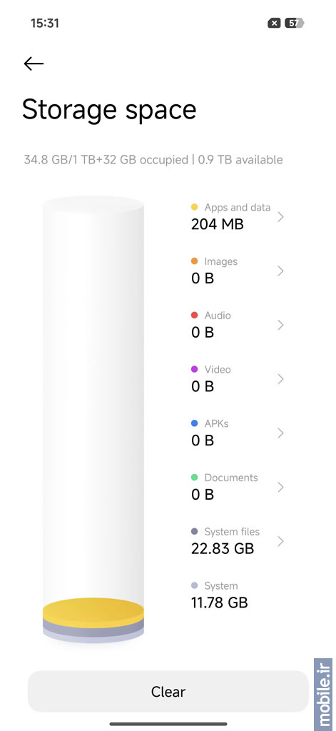 در نسخه 1 ترابایتی در اختیار ما 34.8 گیگابایت از این حافظه در بوت اولیه و قبل از ایجاد هرگونه تغییر روی حافظه به سیستمعامل و برنامههای اضافی نصب شده تعلق داشت که با حذف این برنامهها میتوان بخشی از این حافظه را آزاد کرد. حافظه داخلی گوشی
