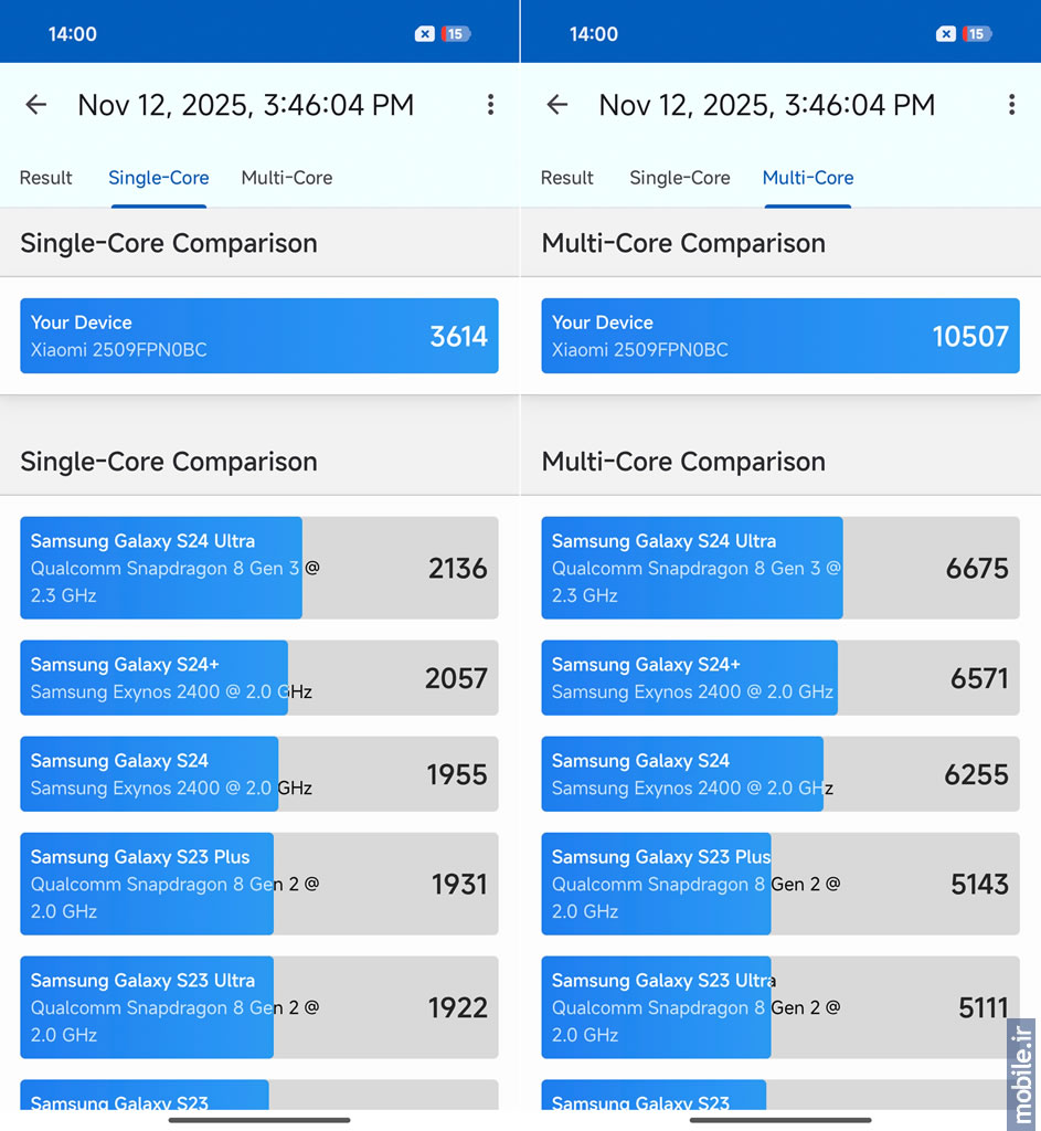 در تست اول طبق معمول بهسراغ آزمون پردازشی Geekbenck 6 میرویم که نوع و فرکانس هستههای پردازشی را بدون دخالت دادن دیگر عوامل مورد بررسی قرار میدهد؛ 17 پرو مکس در این تست در حالت تک هستهای به امتیاز 3,614 واحد دست پیدا میکند و در حالت چند هستهای نیز به حوالی 10,507 واحد بسنده میکند . برای مقایسه بد نیست بدانیم که S25 Ultra سامسونگ با چیپست سال قبل کوالکام یعنی Snapdragon 8 Elite امتیازهای 2,900 و 10 هزار واحدی را کسب کرده بود و حداقل در حالت چند هستهای سایهبهسایه 17 پرو مکس حرکت میکند.