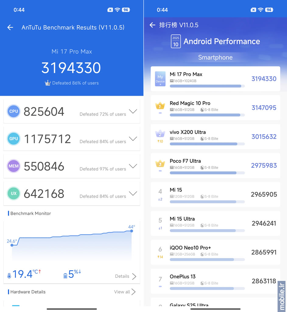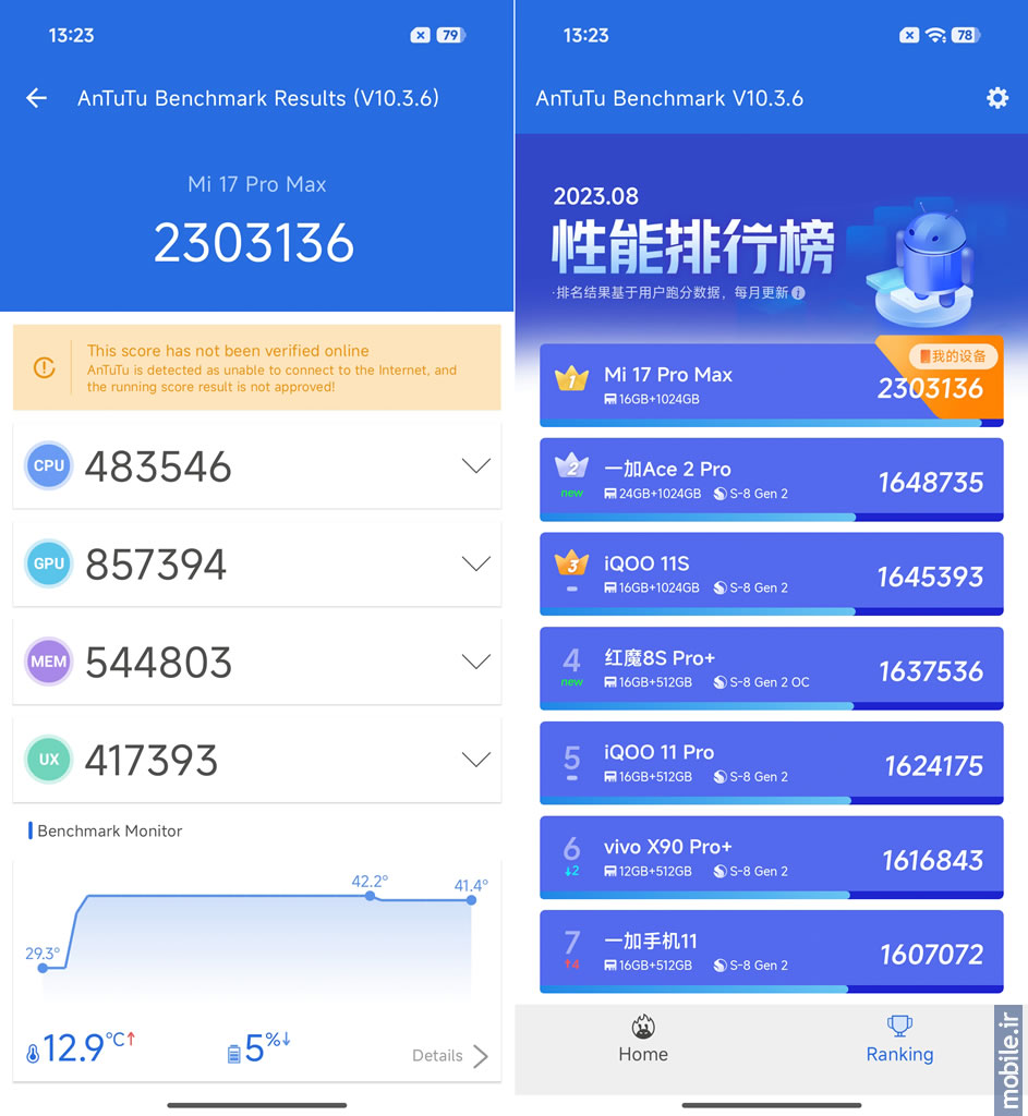 در تست AnTuTu نسخه دهم امتیاز گوشی به حوالی 2 میلیون و 300 هزار واحد میرسد که در اینجا نیز پایینتر از سطح انتظار ظاهر میشود چرا که برخی دیگر گوشیهای دارای پردازنده مشابه 500 تا 700 هزار واحد امتیاز بیشتری را در این تست ثبت کردهاند و S25 Ultra با پردازنده قدیمیتر خود و امتیاز 2 میلیون و 200 هزار واحدی بسیار به 17 پرو مکس نزدیک است.