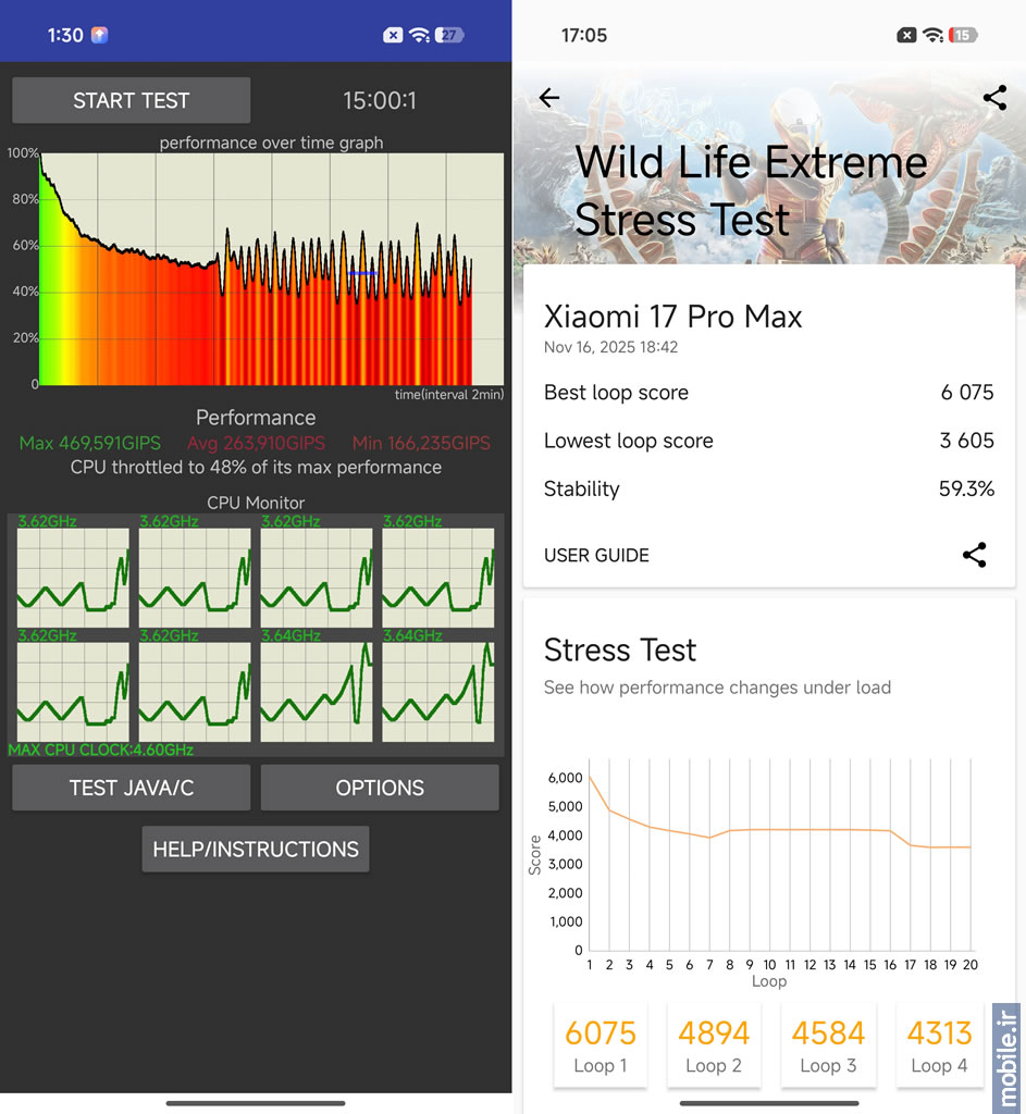 17 پرو مکس زیر بار شدید پردازشی تست CPU Throttling تنها 48 درصد از توان خود را حفظ کرد و این رقم برای تست گرافیکی Wild Life Extreme Stress Test به فقط 56 درصد رسید. گوشی در حین اجرای این دو تست بهشدت داغ شد تا حدیکه بهسادگی امکان در دست گرفتن آن نبود!
