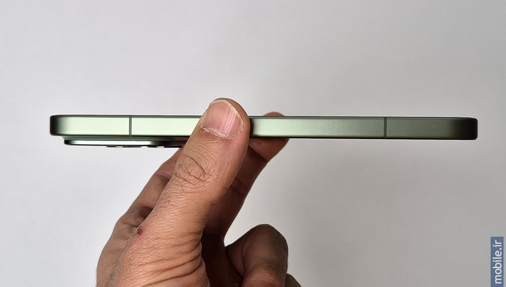 نوار فلزی دورتادور گوشی مات و همرنگ بخش پشتیست و المانهای مشابهای را نسبت به 15 پرو در خود جای داده است. دکمه پاور و ولوم پایین در سمت راست بهخوبی در زیر انگشتان هر دو دست قرار میگیرند اما ولوم بالا اندکی بالاتر از حد معمول دسترسی یک دست طراحی شده است.
