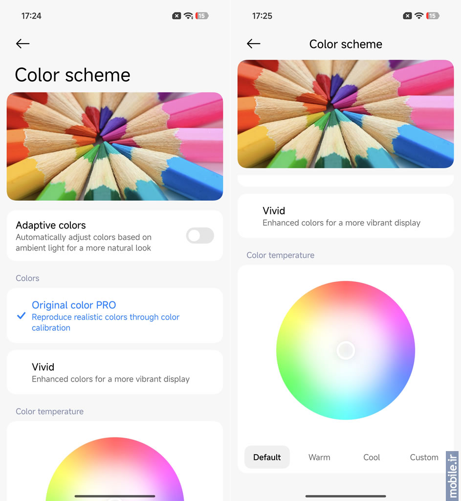 پروفایل رنگی این پنل در منوی Color scheme در حالت پیشفرش روی گزینه Original color Pro قرار گرفته که بهگفته شیائومی با فرایند کالییراسیون رنگهای واقعیتری را ارائه میکند اما در عمل با تغییر این گزینه به Vivid برای رسیدن به رنگهای شادابتر و البته غیر واقعیتر با تغییر خاصی روبرو نمیشویم.
