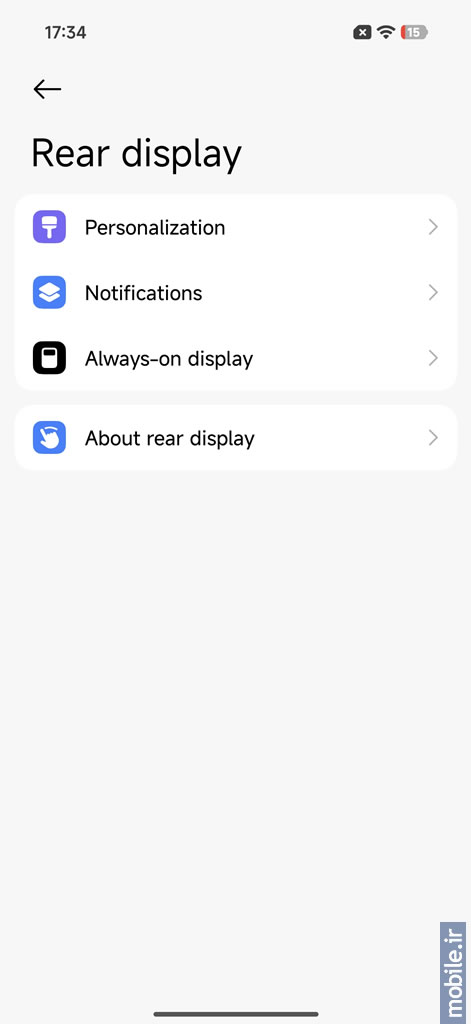 در بخش تنظیمات گزینه جداگانهای برای صفحهنمایش دوم با عنوان Rear display در نظر گرفته شده که شامل سه گزینه شخصیسازی (Personalization)، اعلانها (Notifications) و صفحه همواره روشن (Always-on display) میشود.