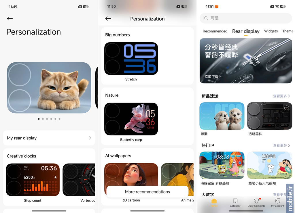 در بخش شخصیسازی میتوان تصویر پسزمینه صفحهنمایش دوم را از بین انتخابهای موجود انتخاب کرد و یا با زدن More recommendations از پایین صفحه به نمامونههای آنلاین آن در فروشگاه Theme شیائومی دست پیدا کرد.