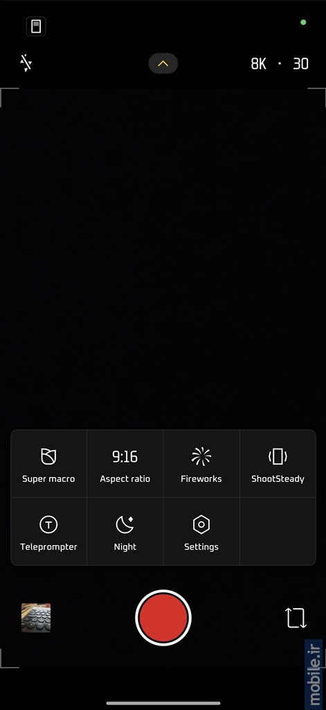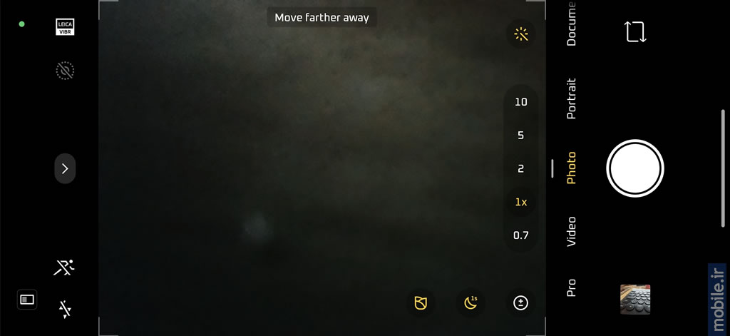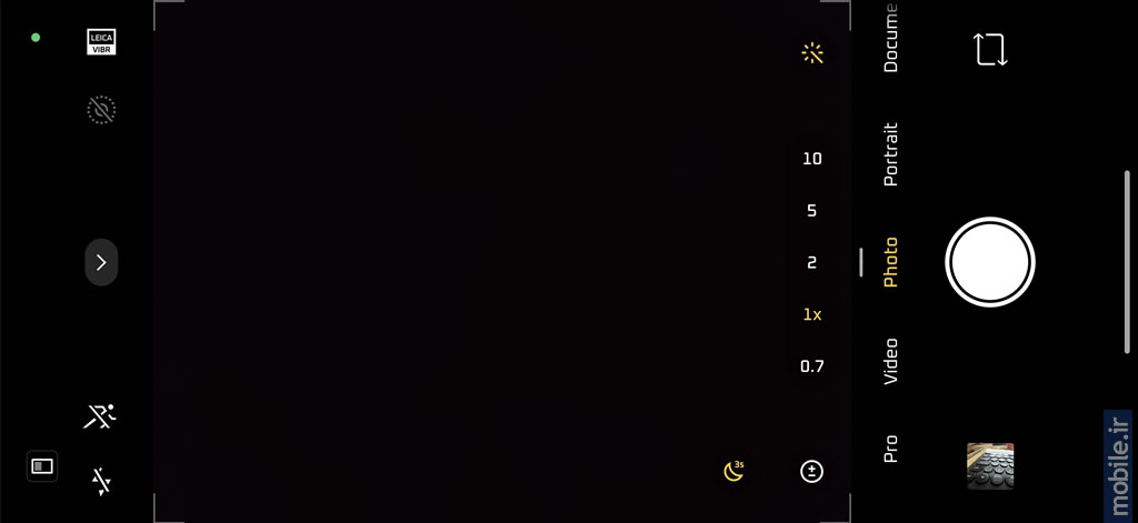 تنظیمات فلش، حالت سوژه متحرک (Moving capture)، داینامیک شات (برای گرفتن چند ثانیه ویدئو قبل از گرفتن هر عکس) و استایل لایکای پیشفرض دیگر موارد حاضر در سمت چپ را تشکیل میدهند. 17 پرو مکس در حالت پیشفرض با استایل لایکای موسوم به Vibrant تصویربرداری میکند که با لمس آیکون آن در کناره سمت چپ میتوان آن را به Leica Authentic تغییر داد که نورگیری کمتر و کنتراست بالاتری را ارائه میکند.