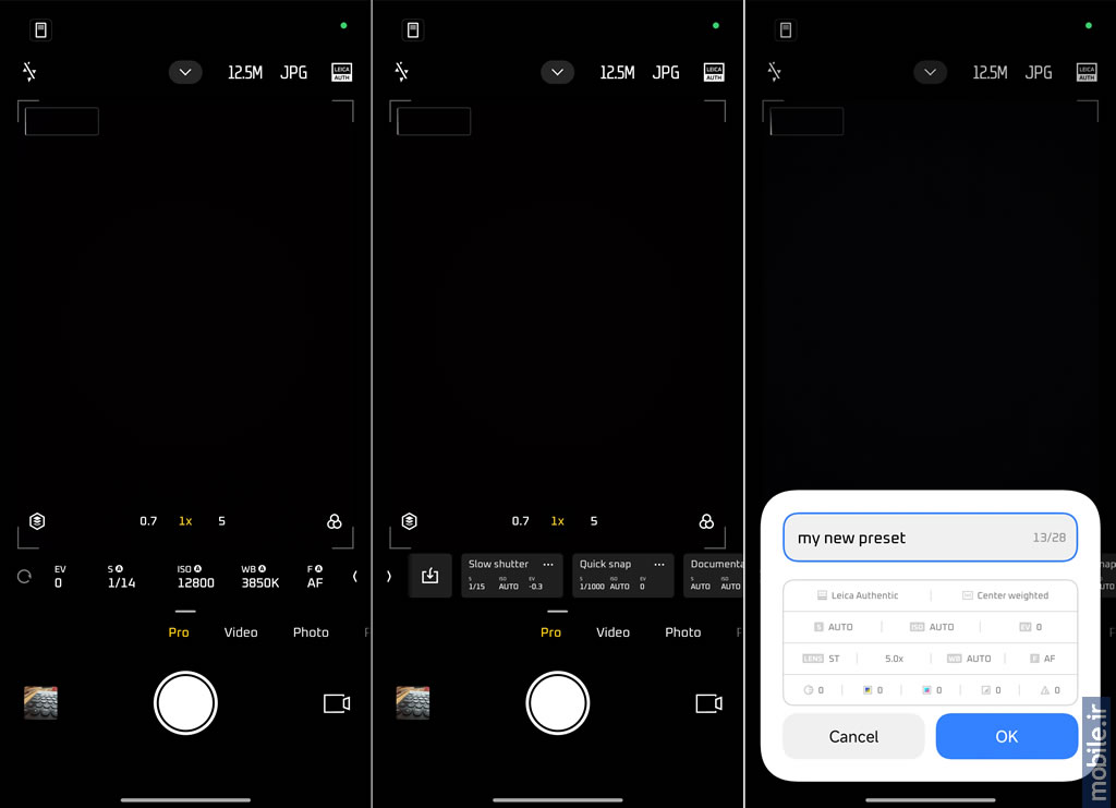با انتخاب گزینه Pro از رابط کاربری دوربین وارد بخش تصویربرداری حرفهای این مجموعه میشویم که طبق معمول امکان تغییر در پنج گزینه نورگیری (عدد Ev)، سرت شاتر (از 1/8,000 تا 30 ثانیه)، عدد ISO یا حساسیت (از 50 تا 12,800)، فوکوس خودکار و White balace را برای هر سه دوربین فراهم میکنند. در این بخش preset یا تنظیمات از قبل آماده شدهای نیز در دسترس قرار دارد که میتوان از آنها برای موقعیتهای مختلف سود جست و امکان ذخیره preset مورد نظر و یا حتی import کردن آنها نیز وجود دارد.