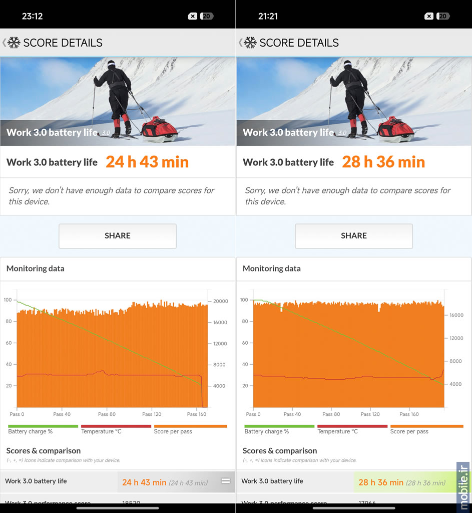 برای تست میزان دوام این باتری نیز مثل همیشه از آزمون Work 3.0 پیسیمارک استفاده میکنیم و پس از تنظیم روشنایی صفحه روی 50 درصد و غیر فعال کردن روشنایی خودکار، آن را یک بار با نرخ رفرش حداکثر 120 هرتزی و بار دیگر با رفرش 60 هرتزی اجرا کردیم؛ 17 پرو مکس در حالت اول یعنی نرخ رفرش حداکثر 120 هرتزی صفحهنمایش تست مذکور را برای 24 ساعت و 43 دقیقه ادامه داد که رکورد فوقالعادهای در این کلاس بوده و مقایسه آن با S25 Ultra با زمان 14 ساعت و 44 دقیقهای، 10 ساعت اختلاف را نشان میدهد! با کاهش نرخ رفرش به 60 هرتز این زمان حتی از این نیز بیشتر شده و به 28 ساعت و 36 دقیقه میرسد!