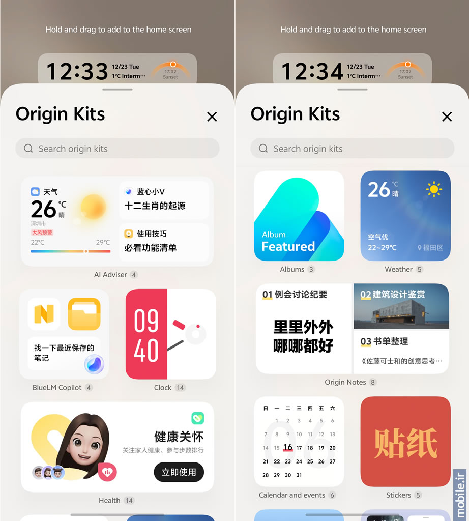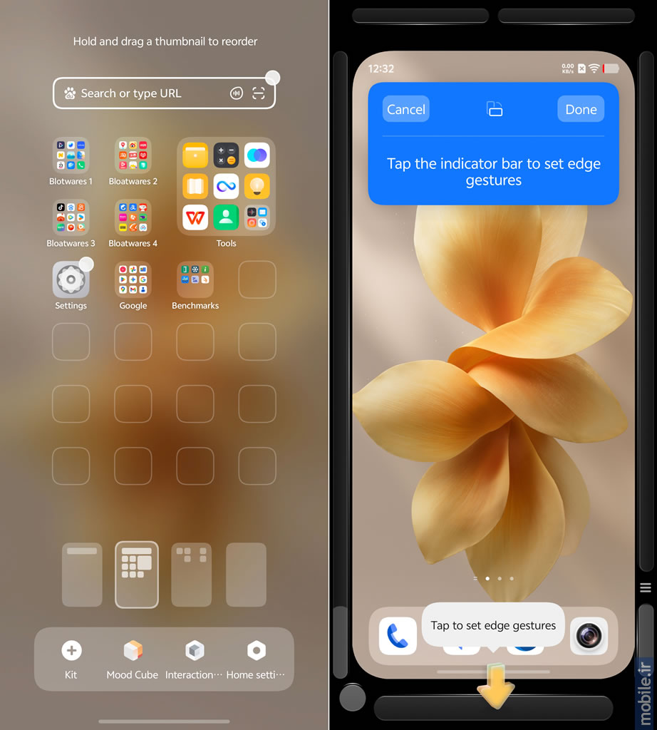 با ورود به مد ویرایشی (با نزدیک کردن دو انگشت به هم یا نگهداشتن انگشت روی صفحه) با گزینههای بیشتری نسبت به همیشه روبرو میشویم که در نسخههای قبلی OriginOS نیز دیده بودیم. در این صفحه جدا از امکان دسترسی به منوی تنظیمات هوماسکرین میتوان بهطور جداگانه پیشنمایشی از هریک از صفحات دسکتاپ را مشاهده کرد و در پایین نیز سهگزینه نا آشنا بهنامهایMoode Cube ،Interaction و Kit دیده میشوند. گزینه Interaction لبههای صفحهنمایش را به شش قسمت مجزا تقسیم میکند که بهجز بخش بالایی که به کنترل سنتر اختصاص دارد میتوان میانبرهای دیگری را به هریک اختصاص داد.