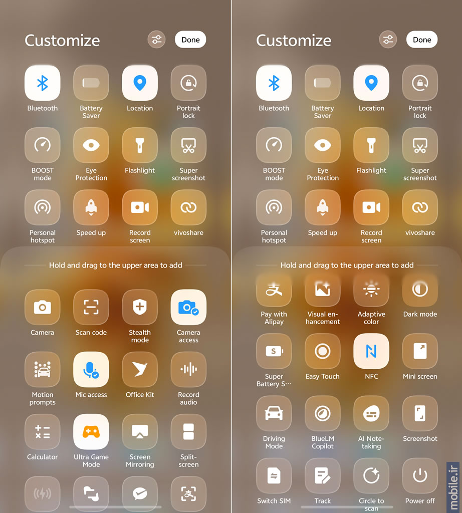 با لمس گزینه Edit از بالا میتوان موارد دیگری را به این لیست افزود که بهصورت عمودی به لیست قبلی افزوده میشوند که موارد جالب توجهای از جمع قطع دسترسی به دوربین و میکروفون (Camera access و Mic access) و Motion prompts برای نمایش نقطههای متحرک برای جلوگیری از سرگیجه در حین استفاده از گوشی در اتومبیل در حال حرکت را در بر میگیرند.