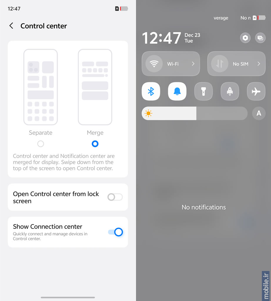 با زدن کلید تنظیمات از بالا به منوی Control center هدایت میشویم که برای ایجاد تغییرات ظاهری در این منو در نظر گرفته شده است. در این بخش با انتخاب گزینه Merge با اولین اسکرول، شش آیکون پر استفاده همراه با اعلان برنامهها بهنمایش گذاشته میشود و با ادامه اسکرول به بقیه آیکونها با اسکرول افقی دست پیدا میکنیم.