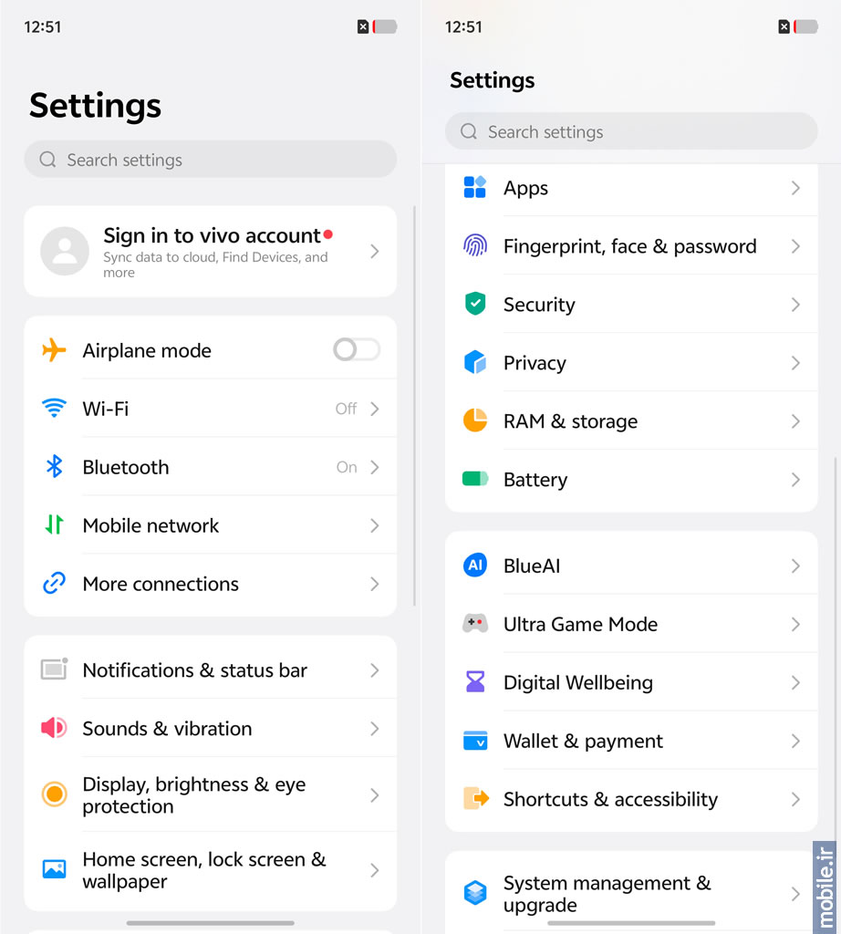 منوی تنظیمات بهجز رنگی شدن آیکونها و تغییر عنوان AI به BlueAI هیچ تفاوتی با OriginOS قبلی نداشته و همان ترکیب پیشین را ارائه میکند. در بالای این منو گزینهای برای جستوجو و ورود به حساب کاربری vivo در نظر گرفته شده و بقیه آیکونها در پنج قسمت مجزا گرد هم آمدهاند. زیرمنوهای این قسمت برخلاف فضای اصلی آن مملو از تنظیمات متعدد و بعضاً گیجکننده است که کاربر را در دریایی از تنظیمات غرق میکنند.
