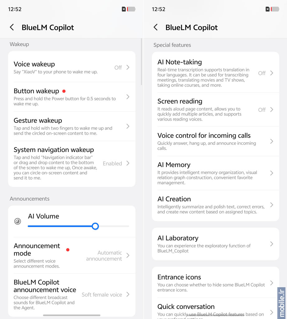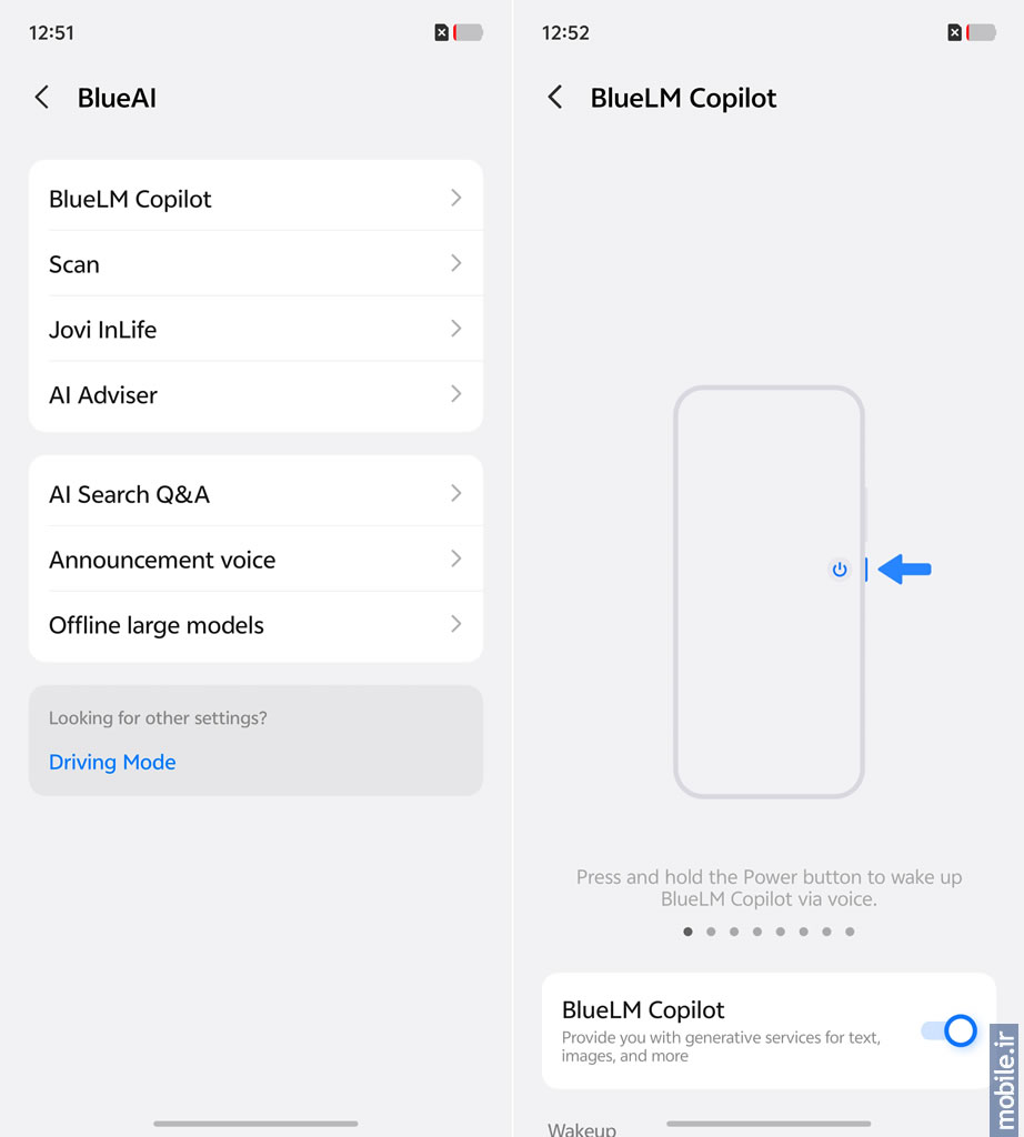 بخش هوش مصنوعی BlueAI تمامی تنظیمات هوش مصنوعی گوشی را در یک منو گرد هم آورده که مثل دیگر قسمتهای OriginOS بسیار مفصل و تو در تو طراحی شده و چینی بودن اکثر امکانات آن نکته منفی بزرگی محسوب میشود. برای نمونه فعالسازی صوتی دستیار هوشمند این بخش نیازمند تلفظ یک عبارت چینیست که فارغ از چرایی آن، خود این عبارت به زبان چینی نوشته شده است.