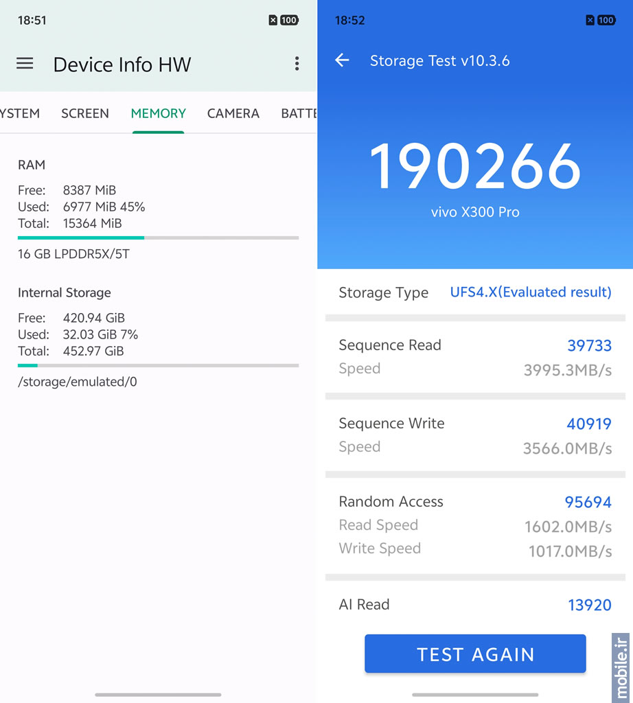 در تست AnTuTu v11.0.7 به امتیاز 3,774.125 واحد دست پیدا میکنیم که یکی از بالاترین امتیازهای ثبتشده در این آزمون است و تنها چند مدل معدود و انگشتشمار از آن فراتر رفتهاند. X300 Pro در این تست کاملاً بالاتر از Xiaomi 17 Pro Max با امتیازی نزدیک به 3,200,000 واحد قرار میگیرد و بار دیگر نتیجه درخشانی در این کلاس محسوب میشود.