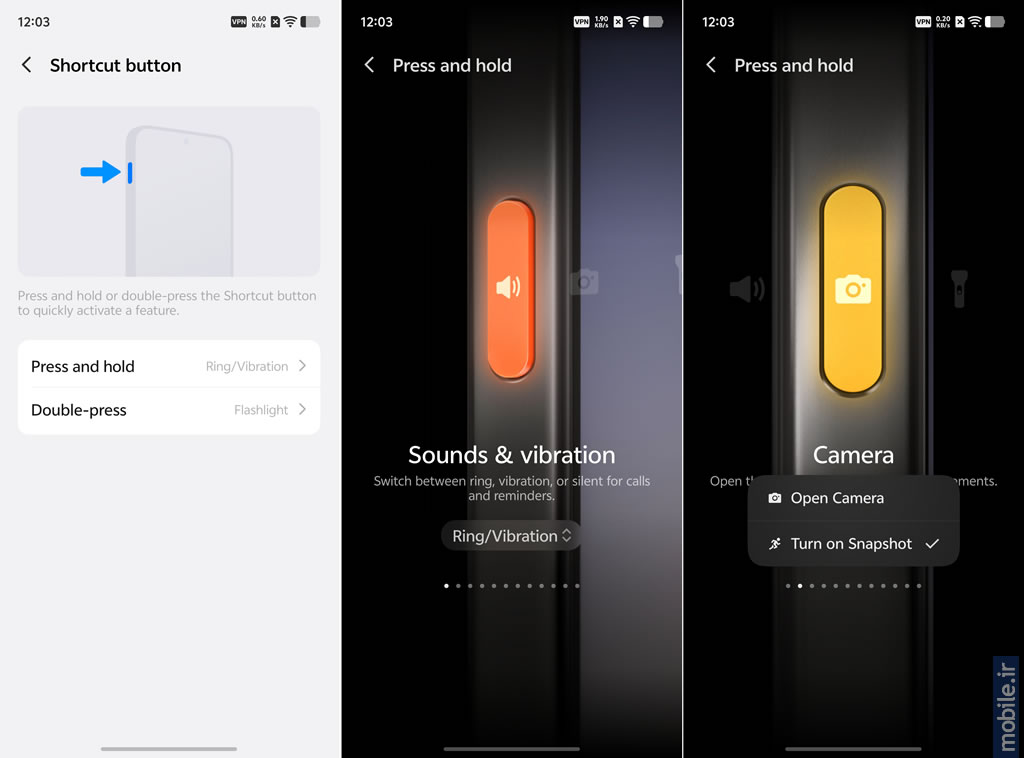 از جمله میانبرهای قابل انتساب به این دکمه میتوان به سوییچ بین پروفایلهای صوتی (زنگ یا ویبره)، فعال کردن دوربین، چراغقوه، یادداشتبرداری، ضبط صدا یا دسترسی به یک اپلیکیشن خاص اشاره کرد. نکته جالب در این میان امکان شخصیسازی بیشتر در برخی از این میانبرهاست بهطوریکه مثلاً با انتخاب دوربین جدا از باز کردن ساده منوی دوربین میتوان گزینه Snapshot را نیز انتخاب کرد یا تنظیم پروفایل صوتی جدا از سوییچ بین زنگ یا ویبره، امکان سوییچ بین سایلنت و ویبره و سایلنت، ویبره و زنگ را نیز فراهم میکند.