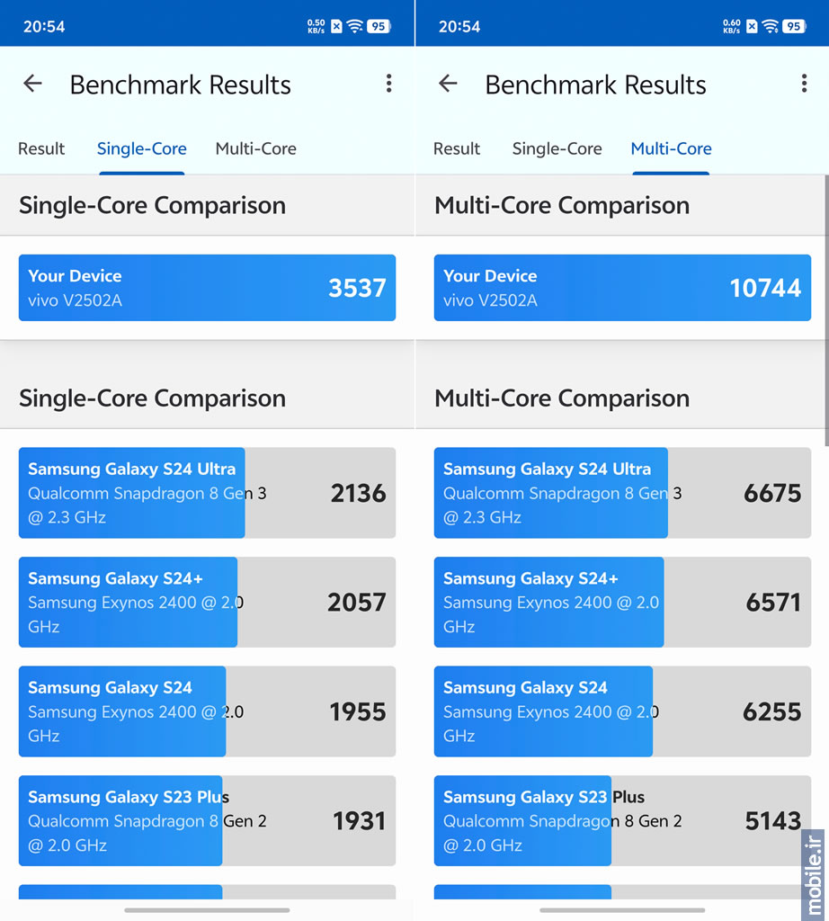 در تست نخست مثل همیشه بهسراغ Geekbench 6 میرویم که توان هستههای پردازشی را بدون دخالت دیگر المانهای گوشی بررسی میکند؛ X300 Pro در این تست با رسیدن به امتیاز 3,537 در حالت تکهستهای و 10,744 در حالت چند هستهای یکی از بالاترین امتیازهای ممکن را بهخود اختصاص میدهد و در کنار شیائومی 17 پرو مکس با امتیازهای 3,614 و 10,507 واحد قرار میگیرد. امتیاز تک هستهای این مدل نسبت به امتیاز 2,900 واحدی S25 Ultra کاملاً بالاتر است اما در حالت تکهستهای تنها 700 واحد فاصله میگیرد.