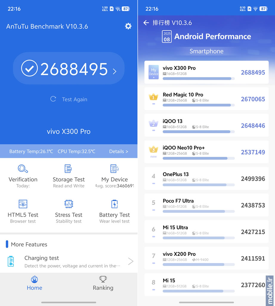 در نسخه دهم این تست نیز به امتیاز 2 میلیون و 688 هزار واحدی دست پیدا کردیم که همچنان رقم بسیار بالایی محسوب میشود و بهسادگی از امتیاز 2 میلیون و 300 هزار واحدی شیائومی 17 پرو مکس عبور میکند.