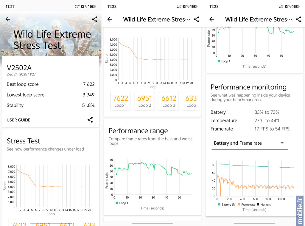 X300 Pro در حین اجرای هیچیک از این تستها (که اغلب تنها چند دقیقه کوتاه بهطول میانجامند) بیش از اندازه گرم و داغ نشد اما داستان در زیر بار سنگین و مداوم تغییرکرد؛ بهطوریکه در آزمون Wild Life Extreme Stress Test که این تست گرافیکی 3DMark را برای 20 بار پیاپی اجرا کرده و نتیجه اولیه را با نتیجه نهایی مقایسه میکند، X300 Pro تنها 51.8 درصد از توان اولیه خود را حفظ کرد و بهشدت در زیر بار گرافیکی گلوگاه شد. این تست حرارت دستگاه را نیز بهشدت بالا برد و از 27 به 44 درجه رساند و 10 درصد نیز از شارژ باتری کاست.