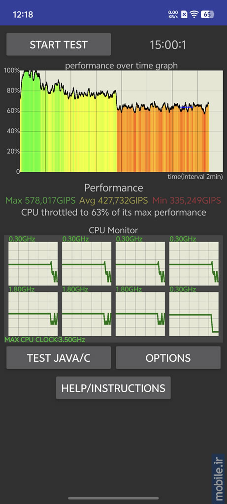در زیر بار سنگین پردازشی و در تست CPU Throttling اما با اوضاع بهتری روبرو شدیم و با اینکه این بار نیز از توان دستگاه کاسته شد و گوشی کاملاً گرم و (حتی تا حدود داغ) شد اما 63 درصد از توان اولیه آن در این تست 15 دقیقهای حفظ شده و با گلوگاه چندانی نیز در نمودارهای آن روبرو نشدیم.