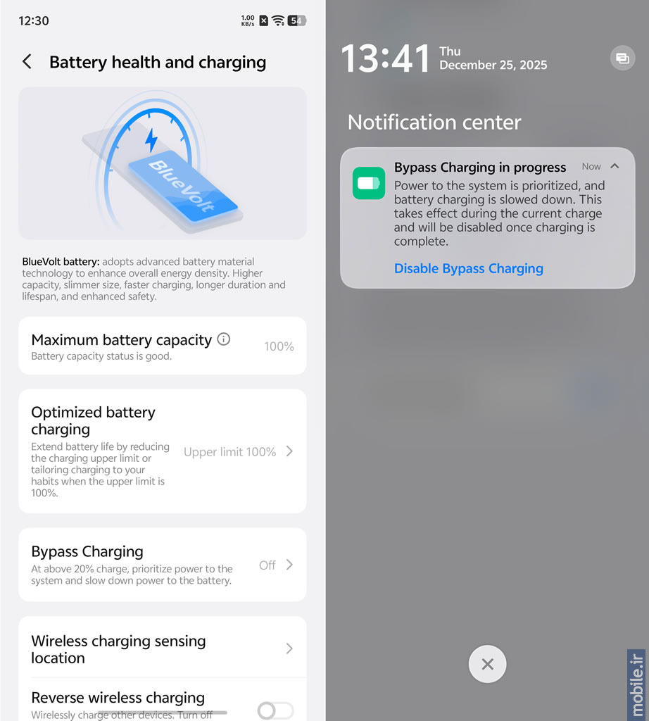 X300 Pro از گزینه Bypass Charging نیز پشتیبانی میکند که در این حالت بهشرایط بالاتر بودن ذخیره باتری از 20 درصد میتوان باتری را از سر راه انتقال انرژی شارژر به سپس به مادربورد برداشت تا انرژی مستقیماً و بدون ایجاد حرارت اضافی به مادربورد منتقل شود. این گزینه برای کنترل دما بهخصوص در حین انجام فعالیتهای طولانیمدت مثل انجام بازی مفید خواهد بود.