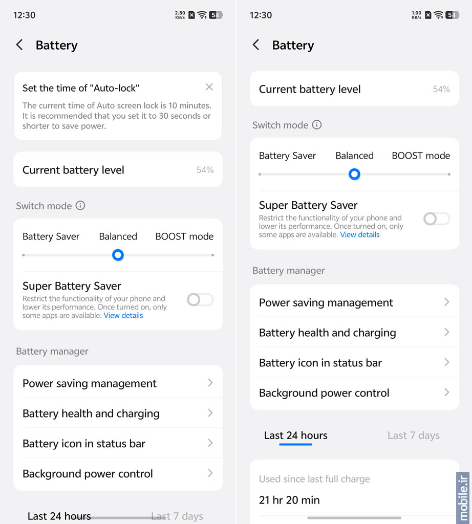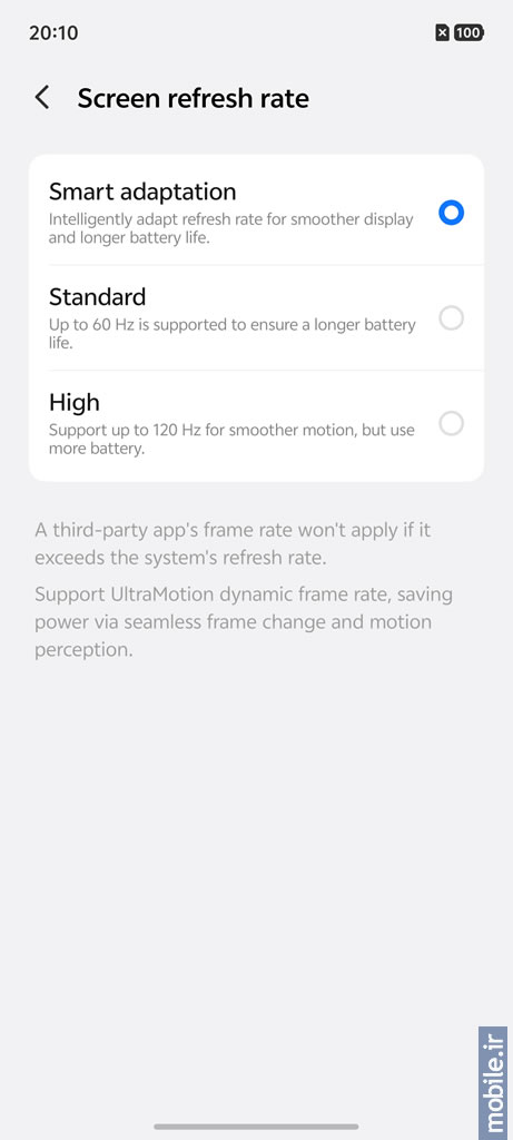 نرخ رفرش یا بهروزرسانی صفحهنمایش طبق انتظار از یک پرچمدار با حضور تکنولوژی بکپلِین LTPO در محدوده گستردهای قابل تغییر بوده و در حین نمایش یک محتوای ثابت و ایستا به 1 هرتز و به محض لمس صفحهنمایش به 120 هرتز افزایش مییابد. از طریق منوی تنظیمات میتوان حداکثر نرخ رفرش را به 60 هرتز کاهش داد که روی کاغذ در مصرف انرژی تأثیر مثبتی برجای میگذارد. به این مورد در بخش باتری و شارژر باز خواهیم گشت.