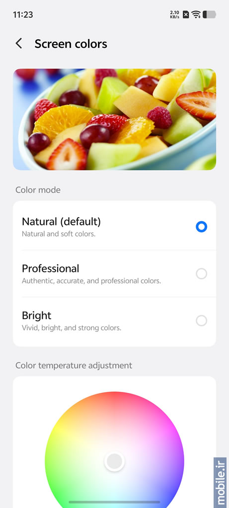 رنگ صفحهنمایش در حالت پیشفرض از منوی Screen colors روی گزینه Natural یا طبیعی قرار گرفته که عملاً تفاوت بزرگی با گزینه موسوم به Professional یا حرفهای این منو نداشته و هردو نسبت به گزینه Bright با رنگهای زنده و اغراقشده تصویر طبیعیتری را ارائه میکنند در پایین این منو نیز میتوان حرارت رنگ را بهدلخواه از یک دایره رنگی انتخاب کرد.
